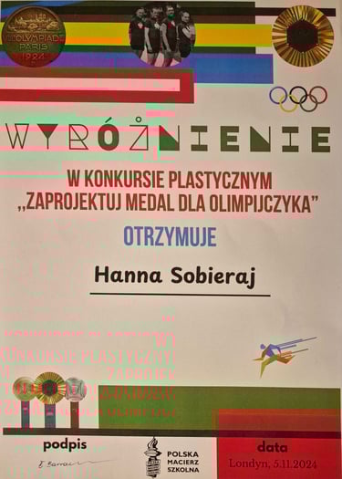 🎨 Hania Sobieraj zdobyła wyróżnienie w konkursie plastycznym „Zaprojektuj medal dla olimpijczyka”. Jej wyjątkowy projekt wyróżniał się pomysłowością i starannością wykonania, co sprawiło, że znalazła się w gronie nagrodzonych uczestników.
