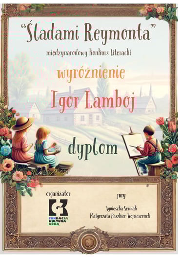 🖋️ Igor Lamboj otrzymał wyróżnienie w tym samym konkursie. Jego twórczość również zwróciła uwagę jury, które doceniło jego wrażliwość literacką oraz umiejętność nawiązywania do tematyki związanej z Reymontem.