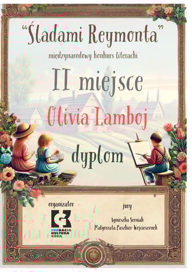 📖 Olivia Lamboj zdobyła II miejsce w konkursie literackim „Śladami Reymonta”. Jej praca została wysoko oceniona za oryginalność, piękny styl i głębię przekazu. To ogromny sukces, zwłaszcza że konkurs miał ogólnopolski zasięg i zgromadził wielu utalentowanych młodych pisarzy.