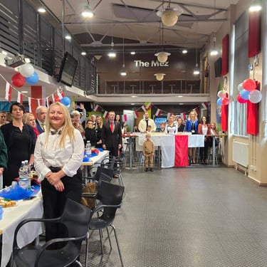 Uroczystość rozpoczęła się od serdecznego powitania gości przez dyrekcję szkoły, która podkreśliła znaczenie wspólnoty, zaangażowania i pracy całej społeczności szkolnej w budowaniu miejsca przyjaznego edukacji i pielęgnowaniu polskiej kultury. 🇵🇱💬